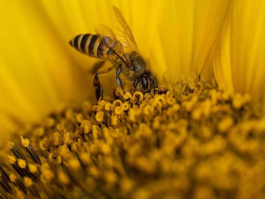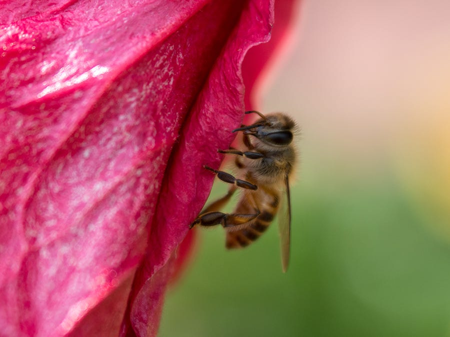 Once youâve got a bee in your sights, follow it until it lands and sits still for a moment, get it in focus, and shoot like crazy. Yes, this is going to put you in very close and repeated contact with bees. In my experience at the flower show, the bees are like kids in a candy store, so drunk on nectar and pollen that theyâre not interested in anything else, so I havenât had any trouble. YMMV. (If you really want a buffer, use a macro lens with a longer focal length, like 100mm, or even 150 or 180. This will let you fill the frame with the stingy critters from further away.)